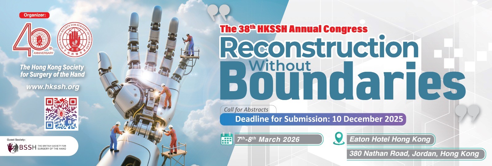 We are delighted to inform you that the Hong Kong Society for Surgery of the Hand (HKSSH) will be hosting the 38th Annual Congress on 7-8 March 2026 at Eaton Hotel Hong Kong (380 Nathan Road, Jordan, Hong Kong).