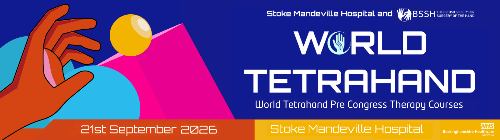 BSSH Home Events World Tetrahand Pre Congress Therapy Symposium World Tetrahand Pre Congress Therapy Symposium 21 September 2026 Stoke Mandeville Hospital, Mandeville Road, Aylesbury, Buckinghamshire, HP21 8AL. Download Event to Calendar Event Map The British Society for Surgery of the Hand (BSSH) and Stoke Mandeville Hospital are excited to invite you to the World Tetrahand Pre Congress Symposium on 21st September 2026 in Aylesbury. You can submit your abstract and register for the meeting now! 📅 Date: 21st September 2026 📍 Venue: Stoke Mandeville Hospital, Mandeville Road, Aylesbury, Buckinghamshire, HP21 8AL. Registration fee: £100 Programme View the programme here Abstracts 📄 Submit an abstract for the meeting here ⏰ Deadline: 31 March 2026 Registration CLICK HERE to register for the meeting Further details about this event Book online for this event Organised by: The British Society for Surgery of the Hand of The British Society For Surgery Of The Hand & Stoke Mandeville Hospital Phone Number: 0207 831 5162 ← Other events Latest Updates What's NewBSSH in the MediaEventsAll EventsInstructional Courses in Hand SurgeryInstructional Courses OverviewNext Instructional CoursePast Instructional CoursesScientific MeetingsBSSH Scientific Meeting 2026Speaker PolicyOld Meeting ProgrammesSubmit an Event for 'Badging'ResearchHand Surgery Evidence Updates Current TrialsHand-2 StudyDISC TrialNEON StudyBSSH James Lind Alliance Priority Setting PartnershipReconstructive Surgery Trials Network HandSRev Pump Priming GrantsBSSH Research Grant/FellowshipBSSH Supported Research ProjectsExternal Hand Surgery ResearchAcademic Profiles Print this page