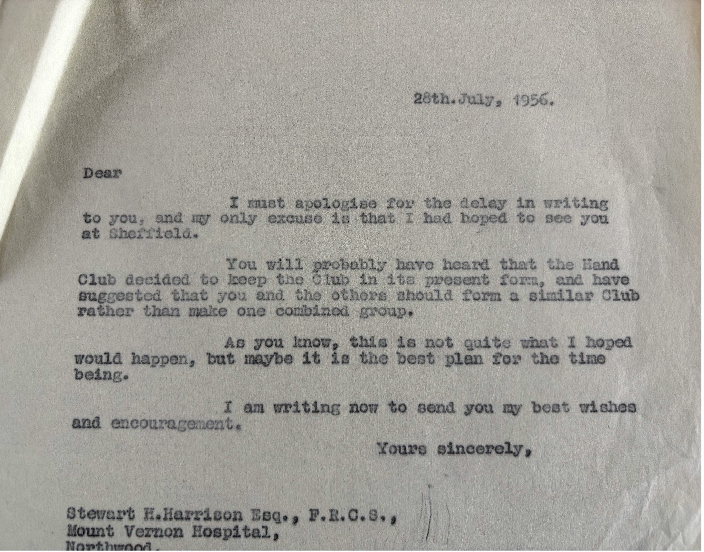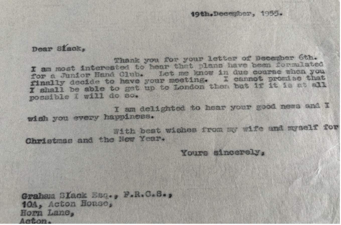 Overall, the letters confirm that Graham Stack, supported by Stewart Harrison were the main drivers to the formation and subsequent development of the Second Hand Club. They also reveal that the strong support of Guy Pulvertaft and his vision and diplomacy, which succeeded in furthering the cause of hand surgery in the United Kingdom.