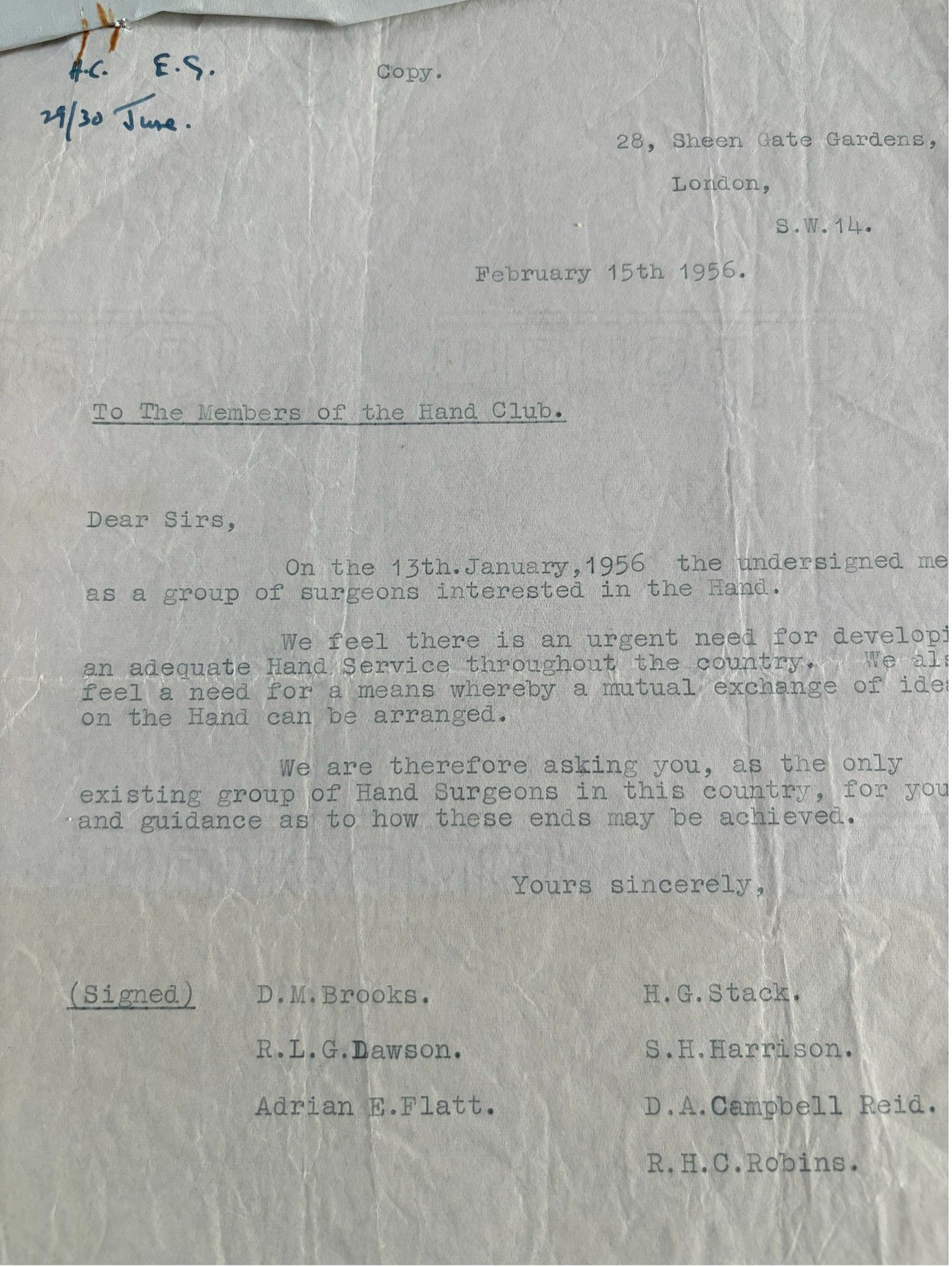 The letters below add detail to the efforts of Guy Pulvertaft and Graham Stack to guide the development of hand surgery during the key period of late 1955 to early 1956. They reveal that their efforts to open up the Hand Club to younger members were unsuccessful, resulting the formation of the Second Hand Club.