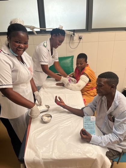 For the first time the LION received a hand nurse specialist volunteer, Maryann Kihembe from Peterborough city hospital. Maryann amazingly managed to carry out training sessions on wound care for the all the OPD, A&E and general ward nurses within a 2 week visit. Maryann also recommended and implemented restructuring of the dressing clinic i.e to separate the plaster room from the dressing room as an infection control measure. She spent time with the surgical team in theatre and appreciated taking part in complex hand trauma surgeries. Maryann also got to spend time with Rachael Jiya and helped audit the electronic wound care and falls assessment tools. Maryann will continue providing guidance, documentation and advice for the LION nurses for the rest of the project period.